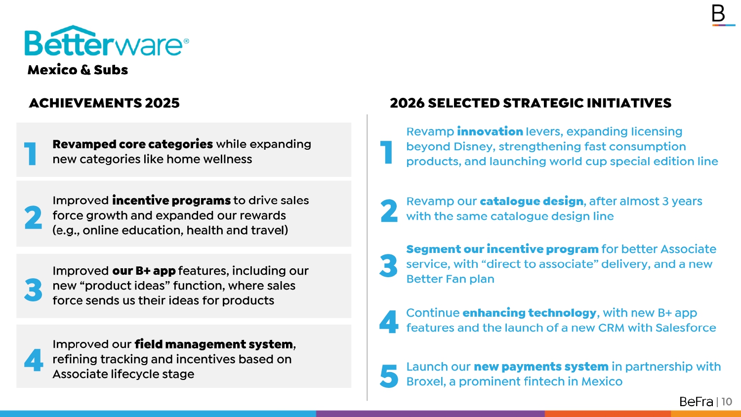 4 1 Pa ge s / ACHIEVEMENTS 2025 2026 SELECTED STRATEGIC INITIATIVES 2 3 Revamp innovation levers, expanding licensing beyond Disney, strengthening fast consumption products, and launching world cup special edition line 1 2 Revamped core categories while expanding new categories like home wellness 3 | 10 Improved incentive programs to drive sales force growth and expanded our rewards (e.g., online education, health and travel) Revamp our catalogue design , after almost 3 years with the same catalogue design line Segment our incentive program for better Associate service, with “direct to associate” delivery, and a new Better Fan plan 5 Improved our B+ app features, including our new “product ideas” function, where sales force sends us their ideas for products Improved our field management system , refining tracking and incentives based on Associate lifecycle stage Launch our new payments system in partnership with Broxel , a prominent f intech in Mexico 4 Mexico & Subs Continue enhancing technology , with new B+ app features and the launch of a new CRM with Salesforce