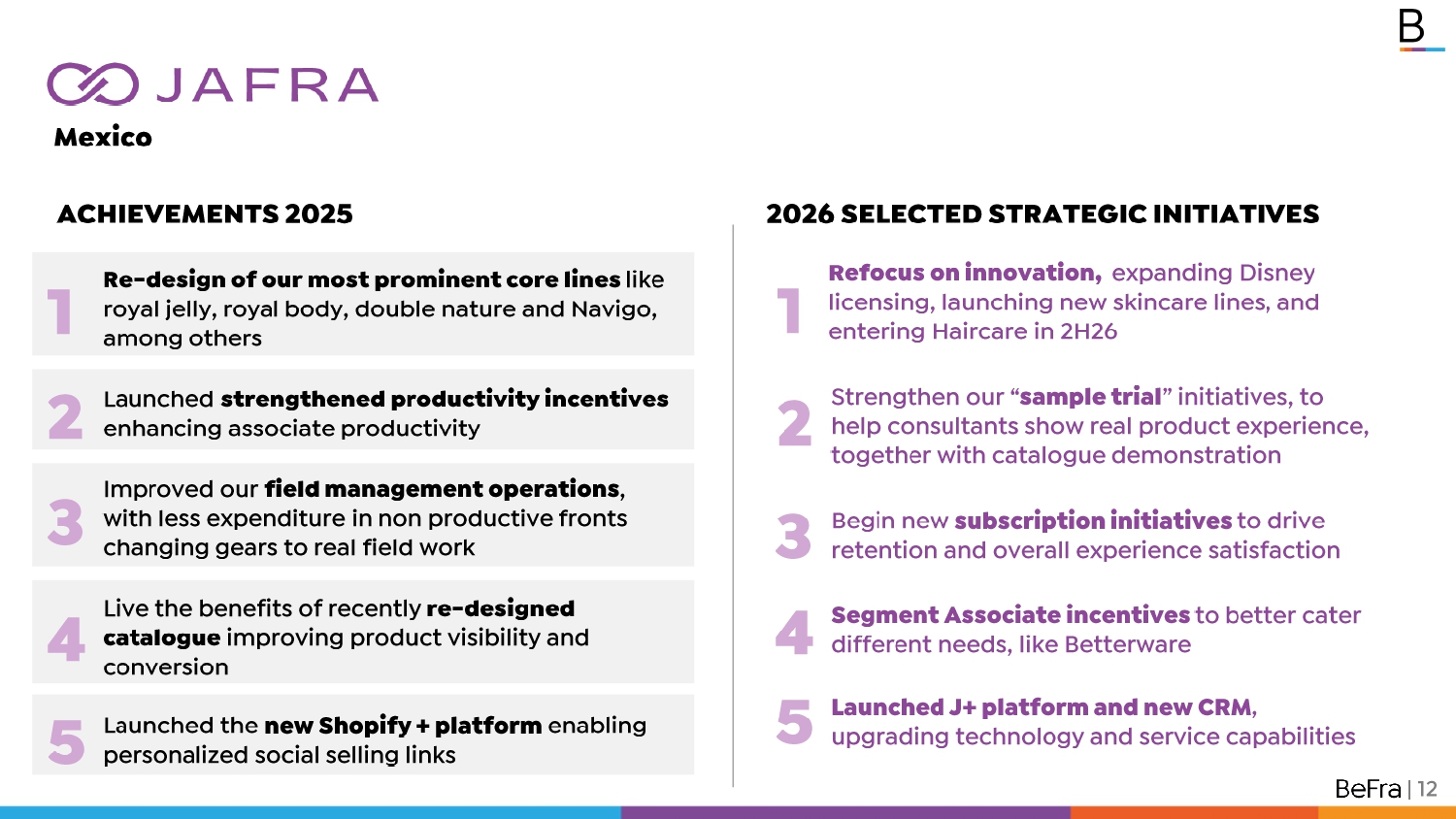 4 1 Pa ge s / 2 3 Refocus on innovation, expanding Disney licensing, launching new skincare lines, and entering Haircare in 2H26 1 2 Re - design of our most prominent core lines like royal jelly, royal body, double nature and Navigo, among others 3 | 12 Launched strengthened productivity incentives enhancing associate productivity Strengthen our “ sample trial ” initiatives, to help consultants show real product experience, together with catalogue demonstration Begin new subscription initiatives to drive retention and overall experience satisfaction 5 5 Improved our field management operations , with less expenditure in non productive fronts changing gears to real field work Live the benefits of recently re - designed catalogue improving product visibility and conversion Launched the new Shopify + platform enabling personalized social selling links Segment Associate incentives to better cater different needs, like Betterware Launched J+ platform and new CRM , upgrading technology and service capabilities 4 ACHIEVEMENTS 2025 2026 SELECTED STRATEGIC INITIATIVES Mexico