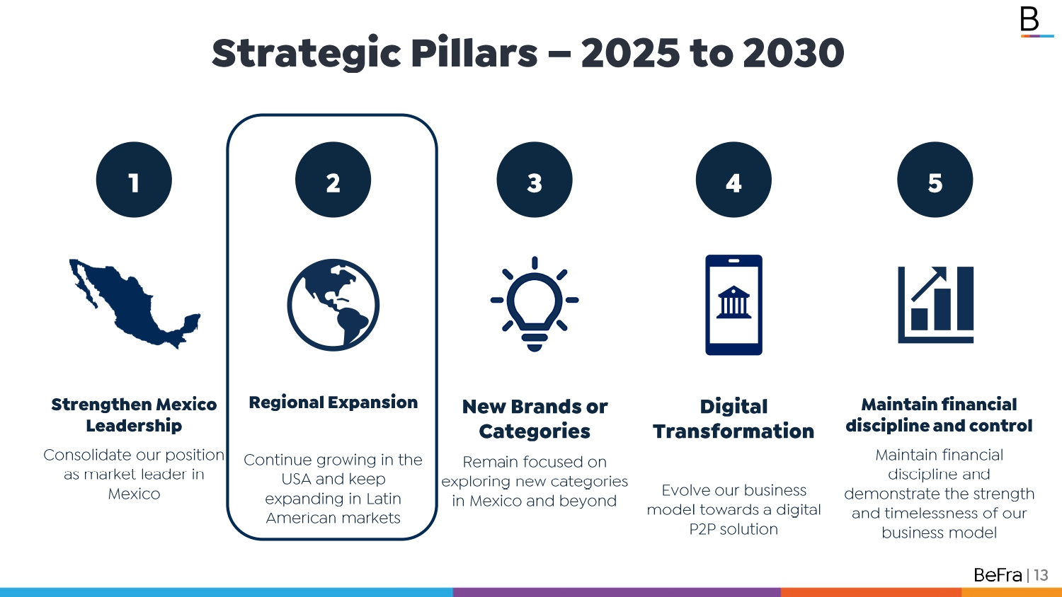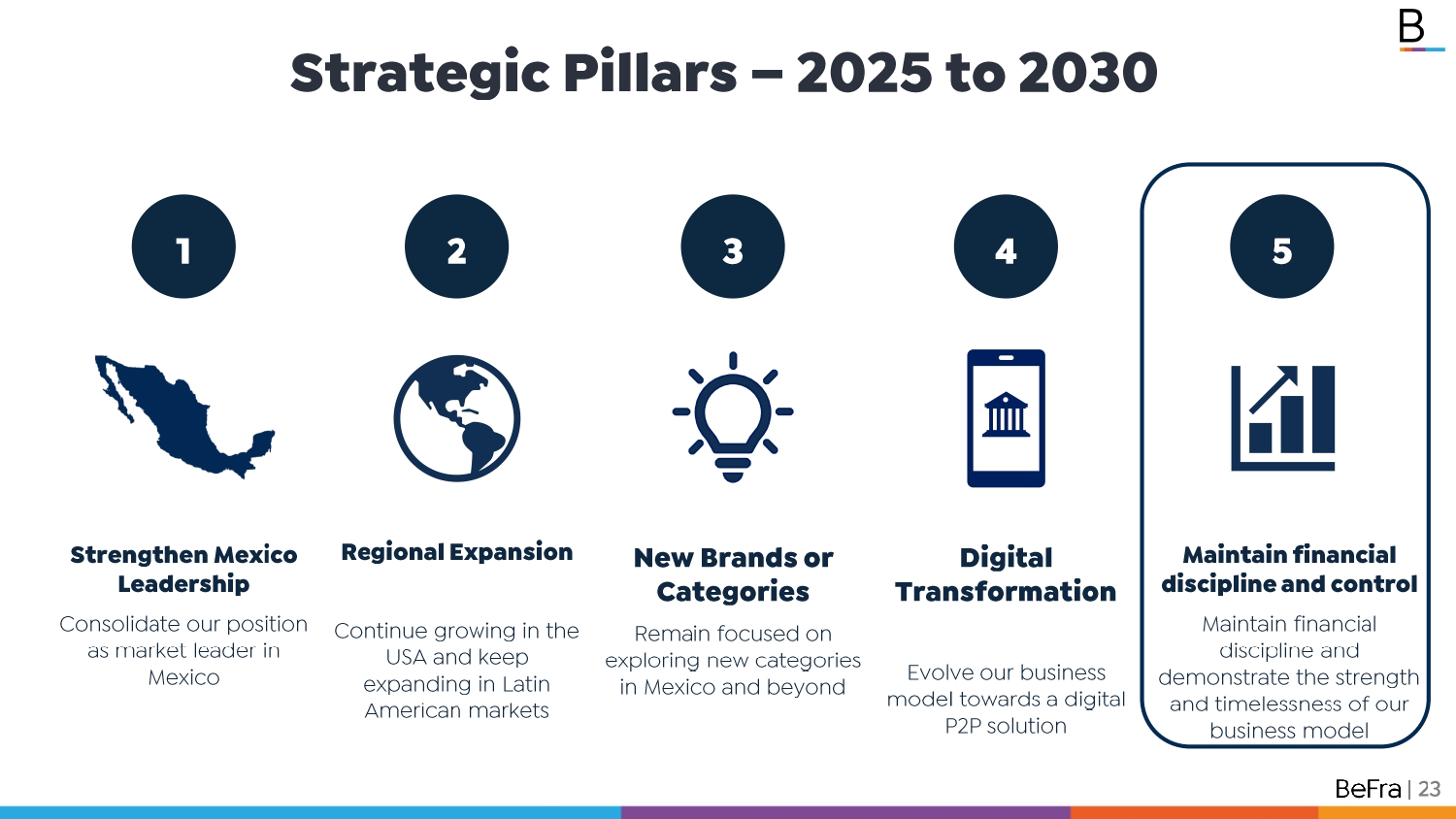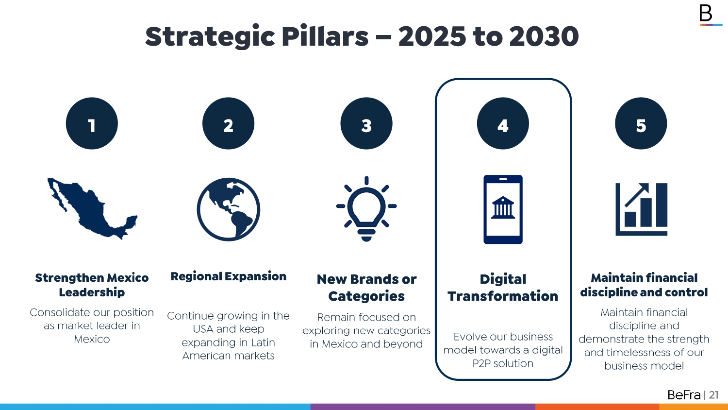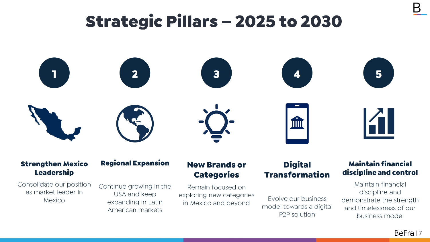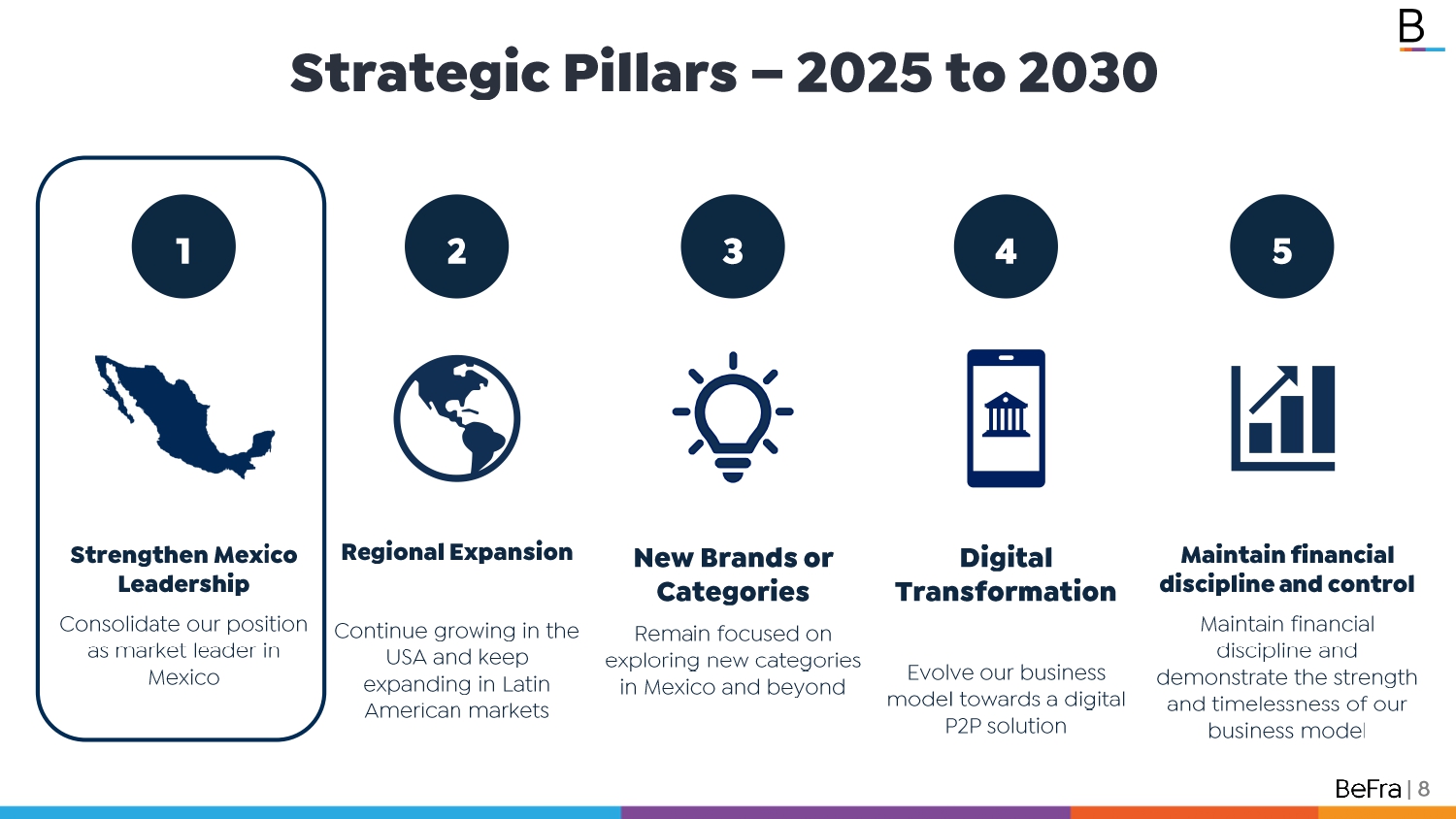 Pages / Strengthen Mexico Leadership Consolidate our position as market leader in Mexico New Brands or Categories Remain focused on exploring new categories in Mexico and beyond Regional Expansion Continue growing in the USA and keep expanding in Latin American markets 1 2 3 Digital Transformation Evolve our business model towards a digital P2P solution 4 Maintain financial discipline and control Maintain financial discipline and demonstrate the strength and timelessness of our business model 5 Strategic Pillars – 2025 to 2030 | 7