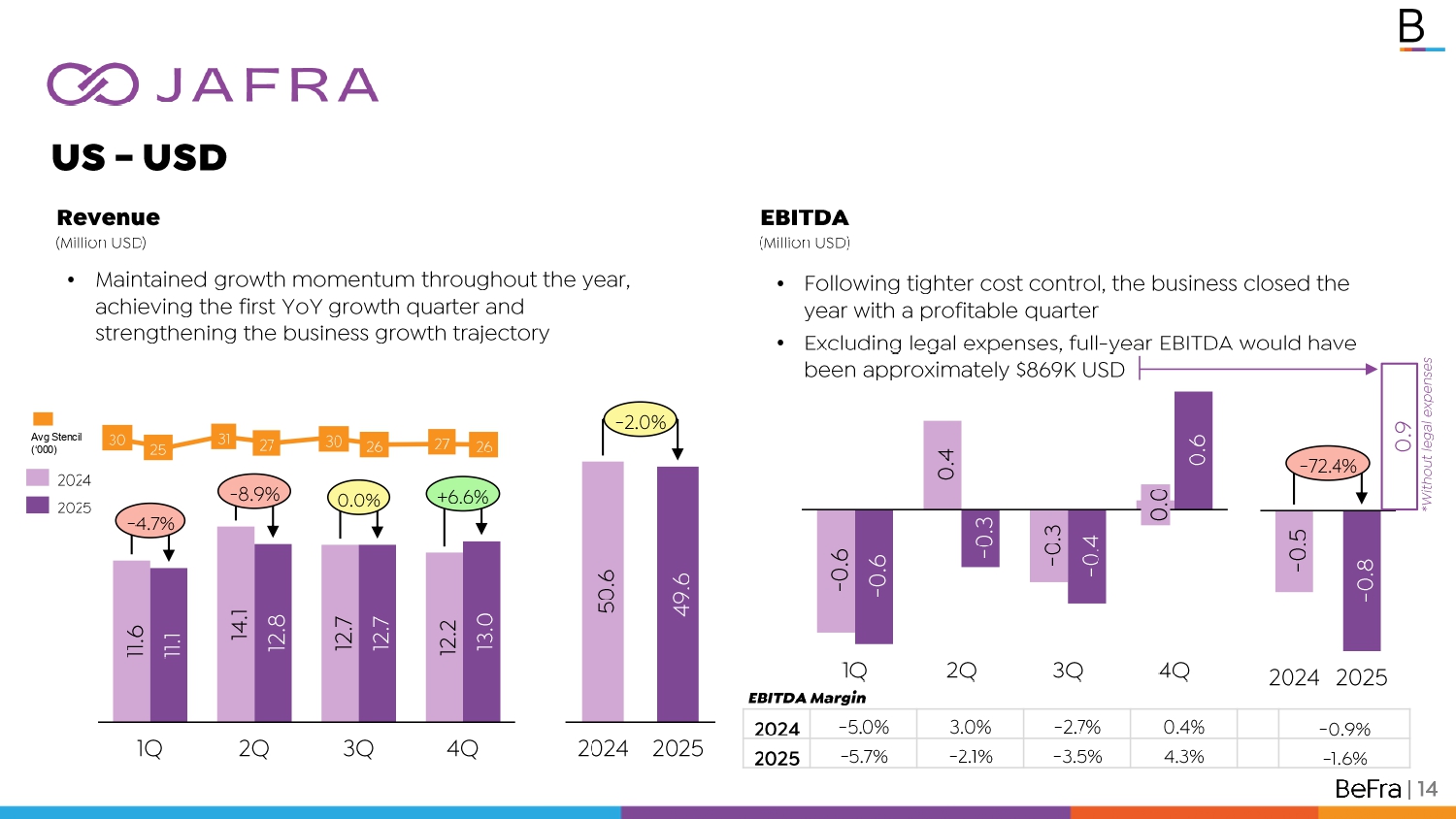 US - USD Revenue (Million USD) | 14 11.6 11.1 1Q 14.1 12.8 2Q 12.7 12.7 3Q 12.2 13.0 4Q - 4.7% - 8.9% 0.0% +6.6% 2024 2025 50.6 2024 49.6 2025 - 2.0% • Maintained growth momentum throughout the year, achieving the first YoY growth quarter and strengthening the business growth trajectory EBITDA ( Million USD ) - 0.6 - 0.6 1Q 0.4 - 0.3 2Q - 0.3 - 0.4 3Q 0.0 0.6 4Q - 0.5 2024 - 0.8 2025 - 72.4% • Following tighter cost control, the business closed the year with a profitable quarter • Excluding legal expenses, full - year EBITDA would have been approximately $869K USD 30 25 31 27 30 26 27 26 - 0.9% 0.4% - 2.7% 3.0% - 5.0% 2024 - 1.6% 4.3% - 3.5% - 2.1% - 5.7% 2025 EBITDA Margin Avg Stencil (‘000) 0.9 *Without legal expenses