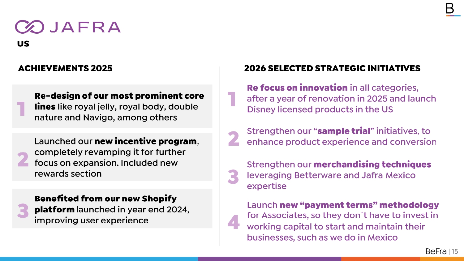 1 Pa ge s / 2 3 Re focus on innovation in all categories, after a year of renovation in 2025 and launch Disney licensed products in the US 1 2 3 | 15 Launched our new incentive program , completely revamping it for further focus on expansion. Included new rewards section Benefited from our new Shopify platform launched in year end 2024, improving user experience Strengthen our “ sample trial ” initiatives, to enhance product experience and conversion Strengthen our merchandising techniques leveraging Betterware and Jafra Mexico expertise Launch new “payment terms” methodology for Associates, so they don ´ t have to invest in working capital to start and maintain their businesses, such as we do in Mexico 4 Re - design of our most prominent core lines like royal jelly, royal body, double nature and Navigo, among others ACHIEVEMENTS 2025 2026 SELECTED STRATEGIC INITIATIVES US