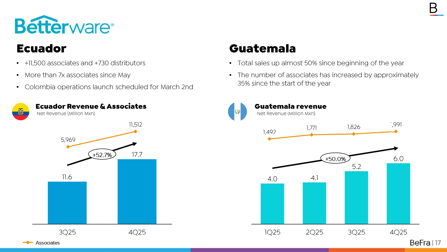 Ecuador Revenue & Associates Guatemala revenue Ecuador • +11,500 associates and +730 distributors • More than 7x associates since May • Colombia operations launch scheduled for March 2nd Guatemala • Total sales up almost 50% since beginning of the year • The number of associates has increased by approximately 35% since the start of the year 1,492 1,771 1,826 1,991 Net Revenue ( Million Mxn ) 1Q25 2Q25 3Q25 4Q25 4.0 4.1 5.2 6.0 +50.0% Net Revenue (Million Mxn ) 5,969 11,512 Associates 3Q25 4Q25 11.6 17.7 +52.7% | 17