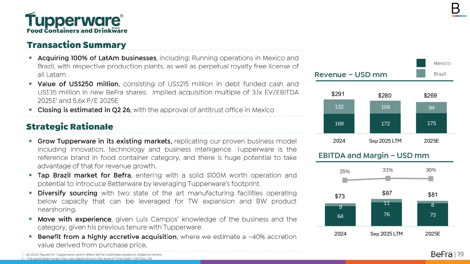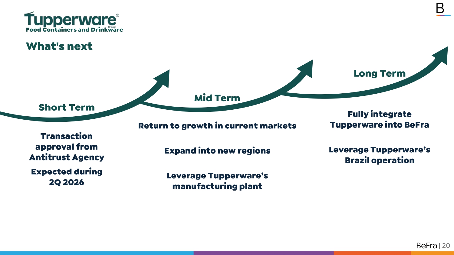 64 76 73 9 11 8 2024 Sep 2025 LTM 2025E 25% 31% 30% Food Containers and Drinkware Transaction Summary | 19 ▪ Acquiring 100 % of LatAm businesses , including : Running operations in Mexico and Brazil, with respective production plants, as well as perpetual royalty free license of all Latam ▪ Value of US $ 250 million , consisting of US $ 215 million in debt funded cash and US $ 35 million in new BeFra shares . Implied acquisition multiple of 3 . 1 x EV/EBITDA 2025 E 1 and 5 . 6 x P/E 2025 E ▪ Closing is estimated in Q 2 26 , with the approval of antitrust office in Mexico Mexico Brazil $73 $81 $87 Revenue – USD mm 169 172 175 122 108 94 2024 Sep 2025 LTM 2025E $291 $269 $280 EBITDA and Margin – USD mm 1 – All 2025 E figures for Tupperware LatAm reflect BeFra’s estimates based on diligence review 2 – The applicable margin may vary depending on the level of Total Debt / EBITDA LTM Strategic Rationale ▪ Grow Tupperware in its existing markets , replicating our proven business model including innovation, technology and business intelligence . Tupperware is the reference brand in food container category, and there is huge potential to take advantage of that for revenue growth . ▪ Tap Brazil market for Befra , entering with a solid $ 100 M worth operation and potential to introduce Betterware by leveraging Tupperware’s footprint . ▪ Diversify sourcing with two state of the art manufacturing facilities operating below capacity that can be leveraged for TW expansion and BW product nearshoring . ▪ Move with experience , given Luis Campos’ knowledge of the business and the category, given his previous tenure with Tupperware . ▪ Benefit from a highly accretive acquisition , where we estimate a ~ 40 % accretion value derived from purchase price .