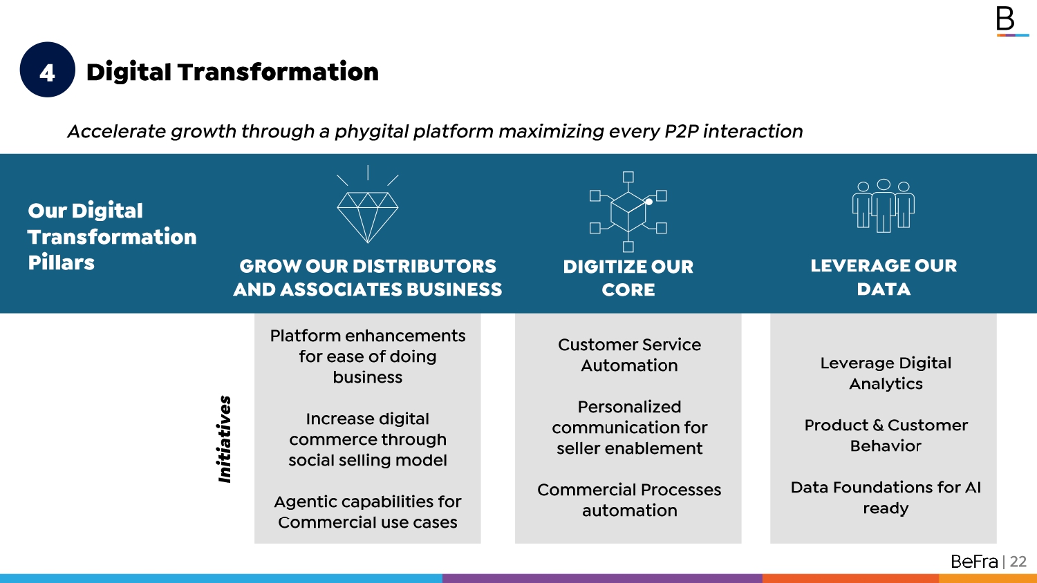 LEVERAGE OUR DATA GROW OUR DISTRIBUTORS AND ASSOCIATES BUSINESS Our Digital Transformation Pillars DIGITIZE OUR CORE Accelerate growth through a phygital platform maximizing every P2P interaction 4 Digital Transformation Platform enhancements for ease of doing business Increase digital commerce through social selling model Agentic capabilities for Commercial use cases Initiatives Customer Service Automation Personalized communication for seller enablement Commercial Processes automation Leverage Digital Analytics Product & Customer Behavior Data Foundations for AI ready | 22