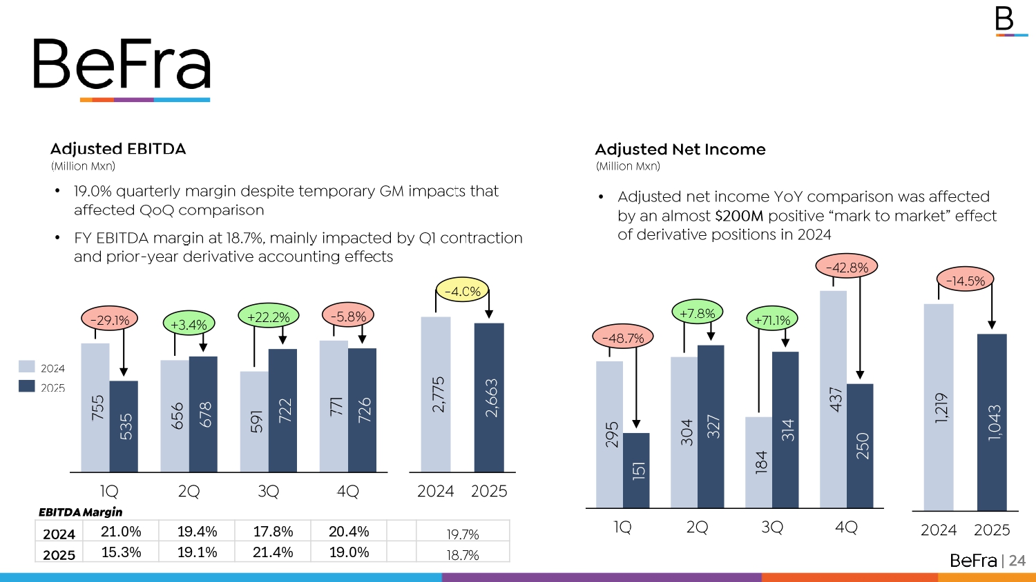 Adjusted EBITDA ( Million Mxn ) 755 656 591 771 535 678 722 726 1Q 2Q 3Q 4Q - 29.1% +3.4% +22.2% - 5.8% 2,775 2024 2,663 2025 - 4.0% | 24 2024 2025 295 151 1Q 304 327 2Q 184 314 3Q 437 250 4Q - 48.7% +7.8% +71.1% - 42.8% Adjusted Net Income • 19.0% quarterly margin despite temporary GM impacts that affected QoQ comparison • FY EBITDA margin at 18.7%, mainly impacted by Q1 contraction and prior - year derivative accounting effects ( Million Mxn ) 1,219 2024 1,043 2025 - 14.5% • Adjusted n et income YoY comparison was affected by an almost $200M positive “mark to market” effect of derivative positions in 2024 19.7% 20.4% 17.8% 19.4% 21.0% 2024 18.7% 19.0% 21.4% 19.1% 15.3% 2025 EBITDA Margin
