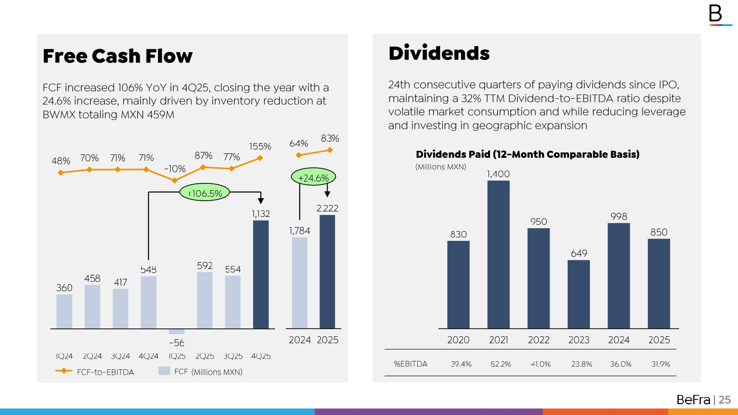 Free Cash Flow FCF increased 106% YoY in 4Q25, closing the year with a 24.6% increase, mainly driven by inventory reduction at BWMX totaling MXN 459M 1Q24 2Q24 3Q24 4Q24 1Q25 2Q25 3Q25 4Q25 360 458 417 548 - 56 592 554 1,132 +106.5% 48% 70% 71% 71% - 10% 87% 77% 155% FCF - to - EBITDA FCF Dividends 24th consecutive quarters of paying dividends since IPO, maintaining a 32% TTM Dividend - to - EBITDA ratio despite volatile market consumption and while reducing leverage and investing in geographic expansion 2020 2021 2022 2023 2024 2025 830 1,400 950 649 998 850 31.9% 36.0% 23.8% 41.0% 52.2% 39.4% %EBITDA Dividends Paid (12 - Month Comparable Basis) | 25 2024 2025 1,784 2,222 +24.6% 64% 83% (Millions MXN) (Millions MXN)