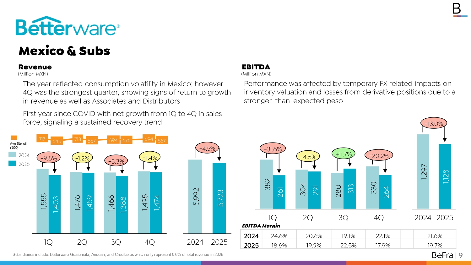 Revenue (Million MXN) Mexico & Subs The year reflected consumption volatility in Mexico; however, 4Q was the strongest quarter, showing signs of return to growth in revenue as well as Associates and Distributors First year since COVID with net growth from 1Q to 4Q in sales force, signaling a sustained recovery trend | 9 1,555 1,403 1Q 1,476 1,459 2Q 1,466 1,388 3Q 1,495 1,474 4Q - 9.8% - 1.2% - 5.3% - 1.4% 2024 2025 5,992 2024 5,723 2025 - 4.5% Subsidiaries include: Betterware Guatemala, Andean, and Credilazos which only represent 0.6% of total revenue in 2025 EBITDA (Million MXN) 382 261 1Q 304 291 2Q 280 313 3Q 330 264 4Q - 31.6% - 4.5% +11.7% - 20.2% 1,297 2024 1,128 2025 - 13.0% Performance was affected by temporary FX related impacts on inventory valuation and losses from derivative positions due to a stronger - than - expected peso 21.6% 22.1% 19.1% 20.6% 24.6% 2024 19.7% 17.9% 22.5% 19.9% 18.6% 2025 EBITDA Margin 717 645 713 657 694 676 694 667 Avg Stencil (‘000)