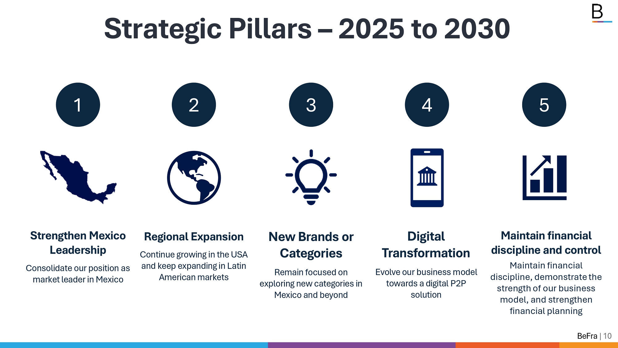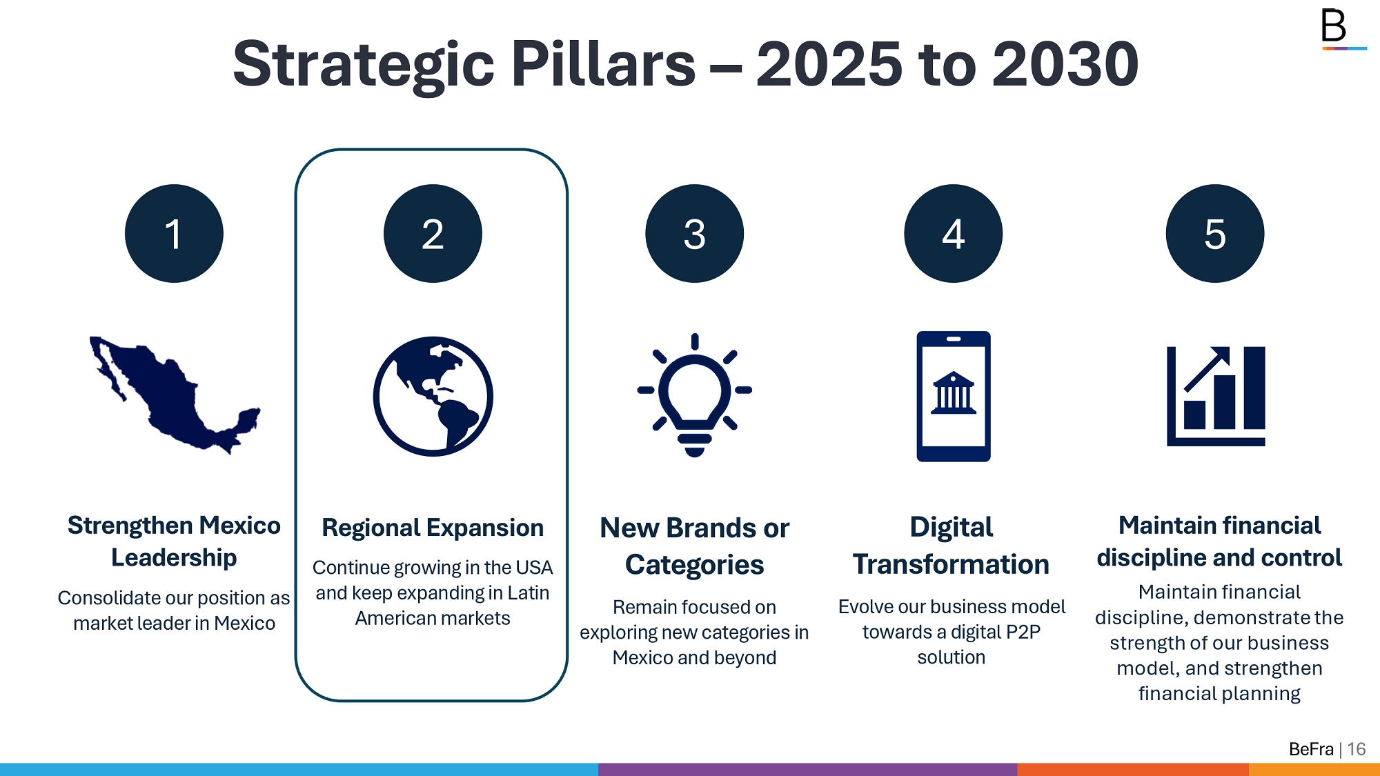 Strengthen Mexico Leadership Consolidate our position as market leader in Mexico New Brands or Categories Remain focused on exploring new categories in Mexico and beyond Regional Expansion Continue growing in the USA and keep expanding in Latin American markets 1 2 3 Digital Transformation Evolve our business model towards a digital P2P solution 4 Maintain financial discipline and control Maintain financial discipline, demonstrate the strength of our business model, and strengthen financial planning 5 Strategic Pillars – 2025 to 2030 BeFra | 16