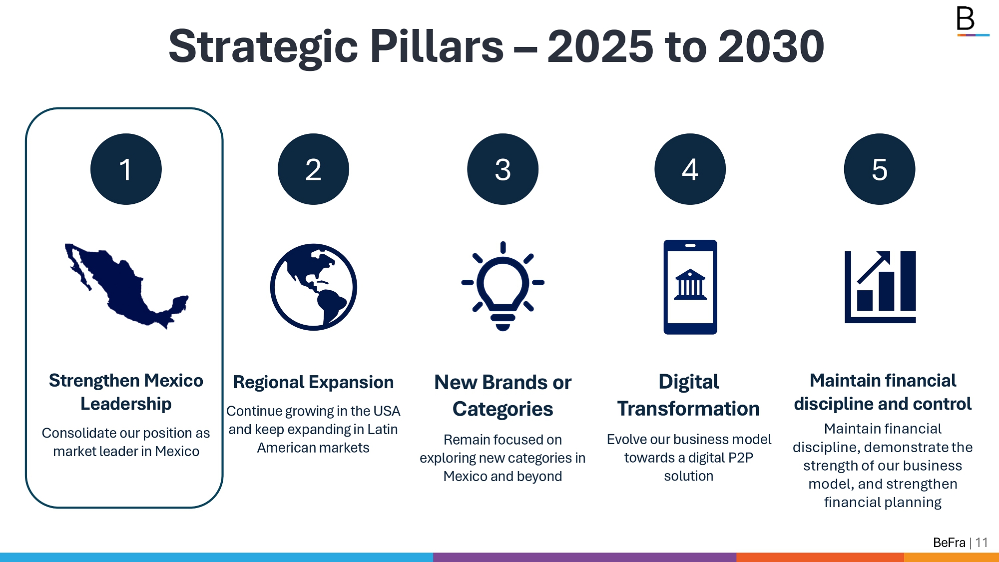 Strengthen Mexico Leadership Consolidate our position as New Brands or Categories Remain focused on Regional Expansion Continue growing in the USA and keep expanding in Latin 1 2 3 Digital Transformation Evolve our business model 4 Maintain financial discipline and control Maintain financial 5 Strategic Pillars – 2025 to 2030 discipline, demonstrate the strength of our business model, and strengthen financial planning American markets market leader in Mexico exploring new categories in Mexico and beyond towards a digital P2P solution BeFra | 10