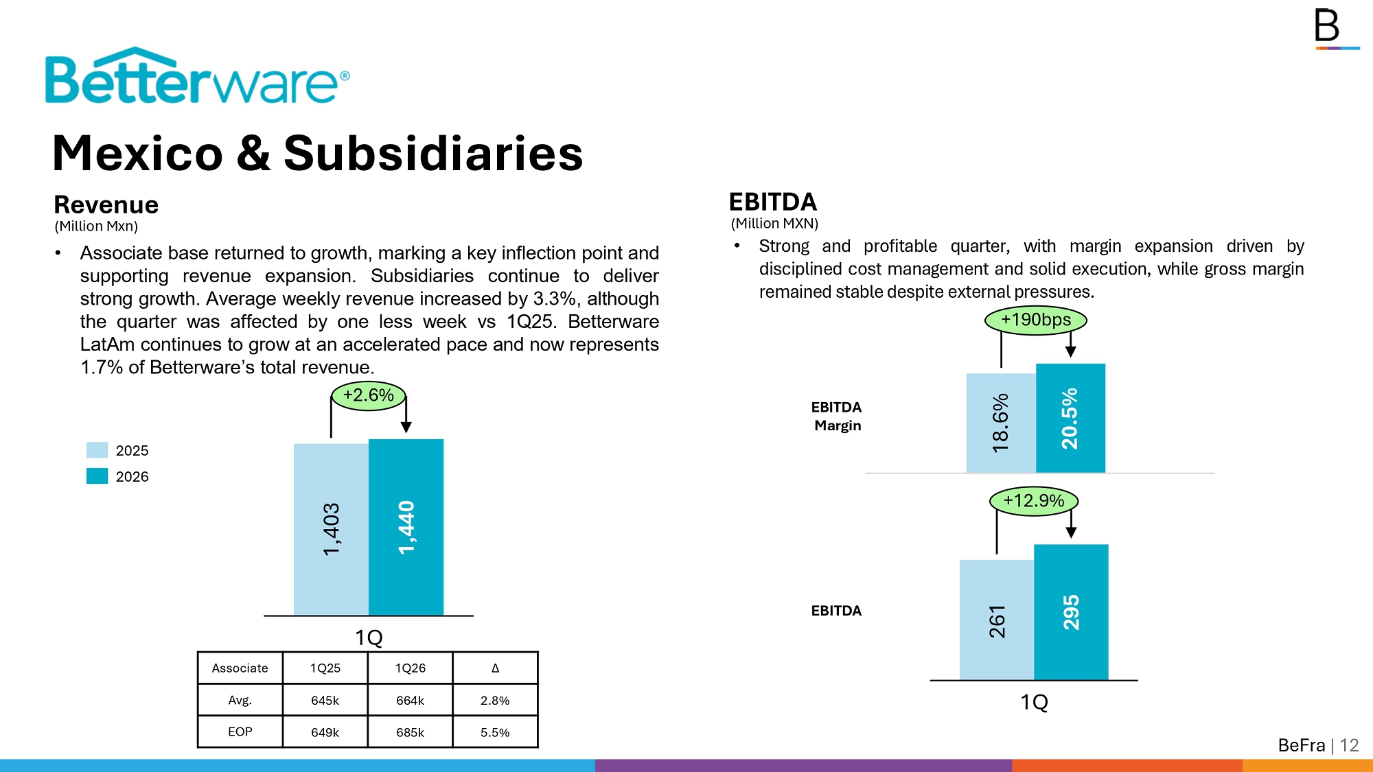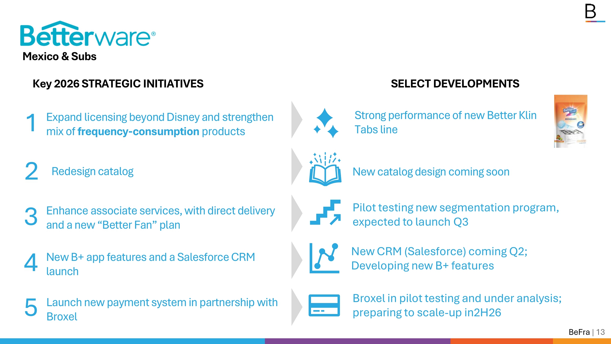 Mexico & Subsidiaries Revenue (Million Mxn) 1,403 1,440 1Q +2.6% 2025 2026 • Associate base returned to growth, marking a key inflection point and supporting revenue expansion . Subsidiaries continue to deliver strong growth . Average weekly revenue increased by 3 . 3 % , although the quarter was affected by one less week vs 1 Q 25 . Betterware LatAm continues to grow at an accelerated pace and now represents 1 . 7 % of Betterware’s total revenue . EBITDA (Million MXN) 261 295 +12.9% 18.6% 20.5% • Strong and profitable quarter, with margin expansion driven by disciplined cost management and solid execution, while gross margin remained stable despite external pressures . +190bps EBITDA Margin 1Q BeFra | 12 EBITDA ∆ 1Q26 1Q25 Associate 2.8% 664k 645k Avg. 5.5% 685k 649k EOP