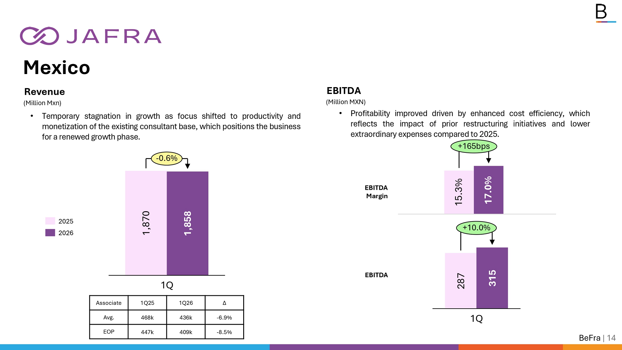 Mexico Revenue (Million Mxn) 1,870 1,858 1Q - 0.6% 2025 2026 • Temporary stagnation in growth as focus shifted to productivity and monetization of the existing consultant base, which positions the business for a renewed growth phase . EBITDA (Million MXN) 287 315 +10.0% 15.3% 17.0% • Profitability improved driven by enhanced cost efficiency, which reflects the impact of prior restructuring initiatives and lower extraordinary expenses compared to 2025 . +165bps EBITDA Margin 1Q BeFra | 14 EBITDA ∆ 1Q26 1Q25 Associate - 6.9% 436k 468k Avg. - 8.5% 409k 447k EOP