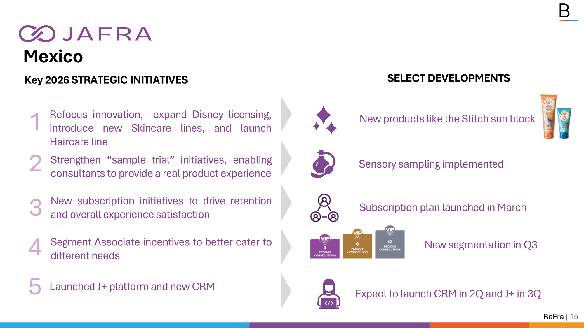 1 2 3 4 Refocus innovation, expand Disney licensing, introduce new Skincare lines, and launch Haircare line Strengthen “sample trial” initiatives, enabling consultants to provide a real product experience New subscription initiatives to drive retention and overall experience satisfaction 5 Launched J+ platform and new CRM Segment Associate incentives to better cater to different needs Mexico Key 2026 STRATEGIC INITIATIVES SELECT DEVELOPMENTS New segmentation in Q3 New products like the Stitch sun block Sensory sampling implemented Subscription plan launched in March Expect to launch CRM in 2Q and J+ in 3Q BeFra | 15