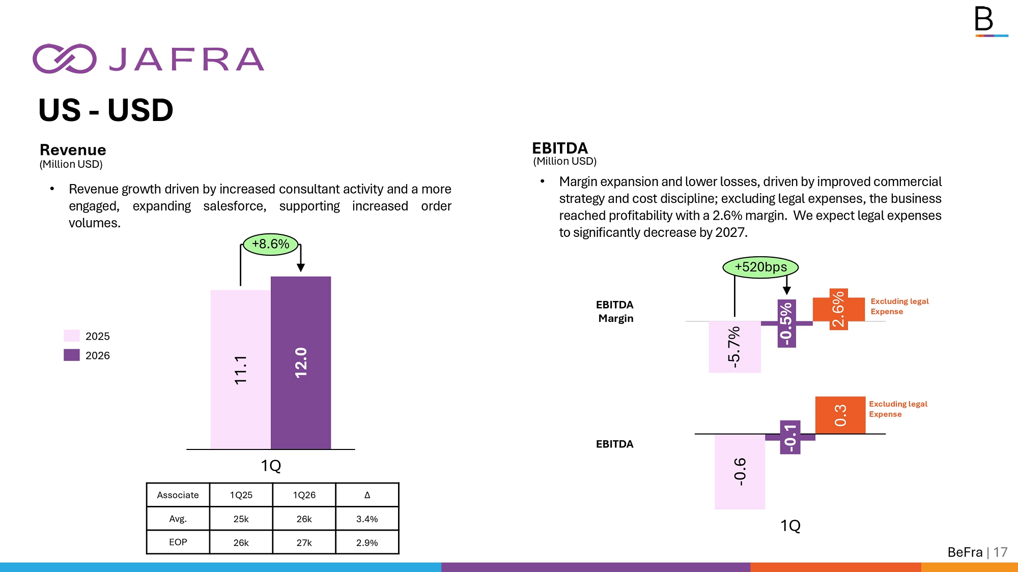US - USD 11.1 12.0 1Q Revenue (Million USD) • Revenue growth driven by increased consultant activity and a more engaged, expanding salesforce, supporting increased order volumes . +8.6% 2025 2026 EBITDA - 0.6 - 0.1 0.3 1Q - 5.7% - 0.5% 2.6% (Million USD) • Margin expansion and lower losses, driven by improved commercial strategy and cost discipline ; excluding legal expenses, the business reached profitability with a 2 . 6 % margin . We expect legal expenses to significantly decrease by 2027 . +520bps BeFra | 17 EBITDA Margin EBITDA Excluding legal Expense Excluding legal Expense ∆ 1Q26 1Q25 Associate 3.4% 26k 25k Avg. 2.9% 27k 26k EOP