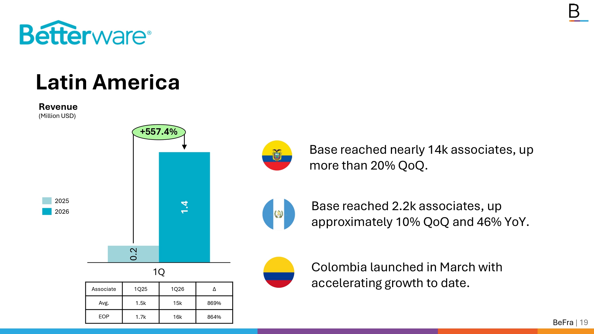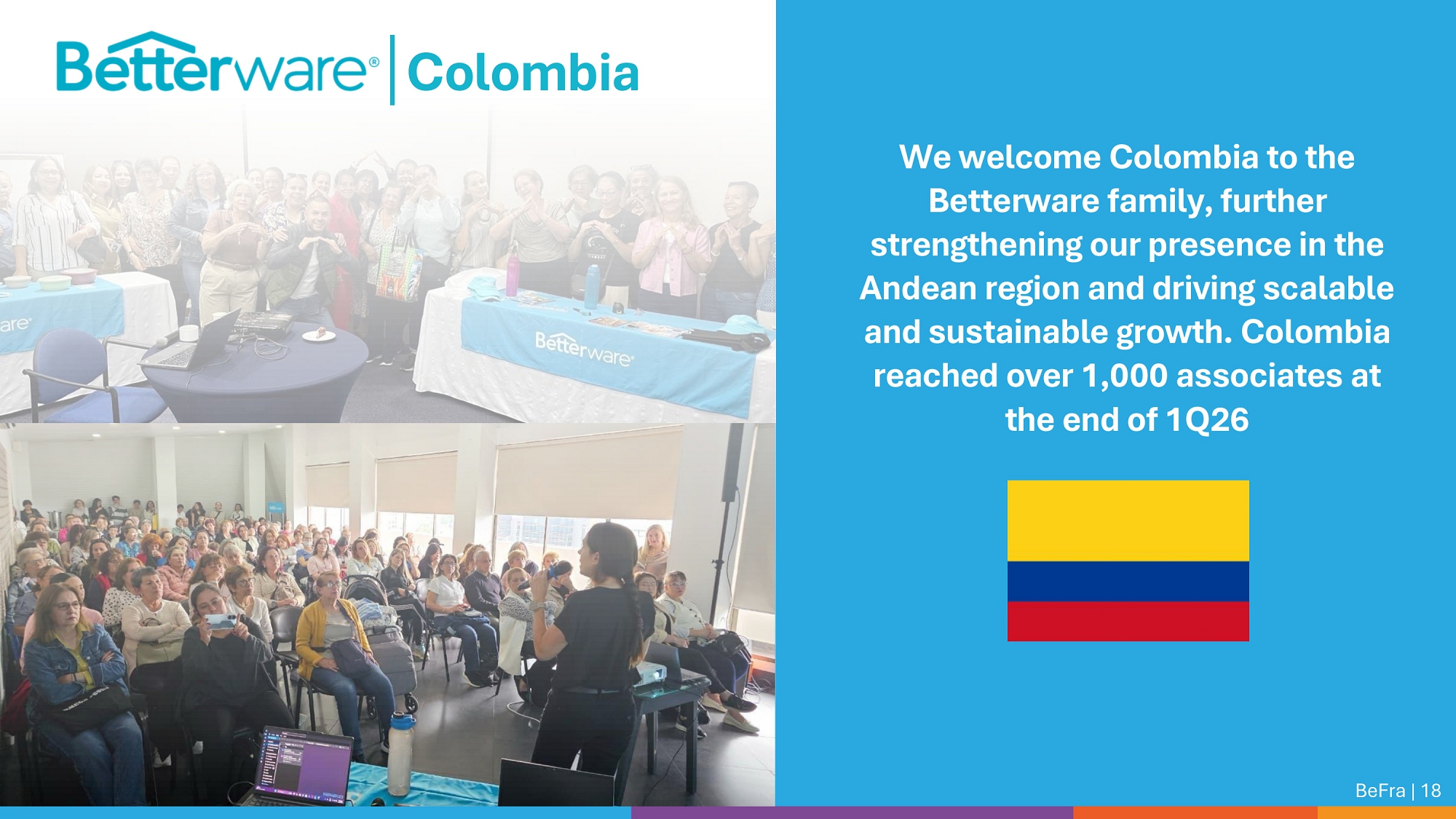 We welcome Colombia to the Betterware family, further strengthening our presence in the Andean region and driving scalable and sustainable growth. Colombia reached over 1,000 associates at the end of 1Q26 Colombia BeFra | 18