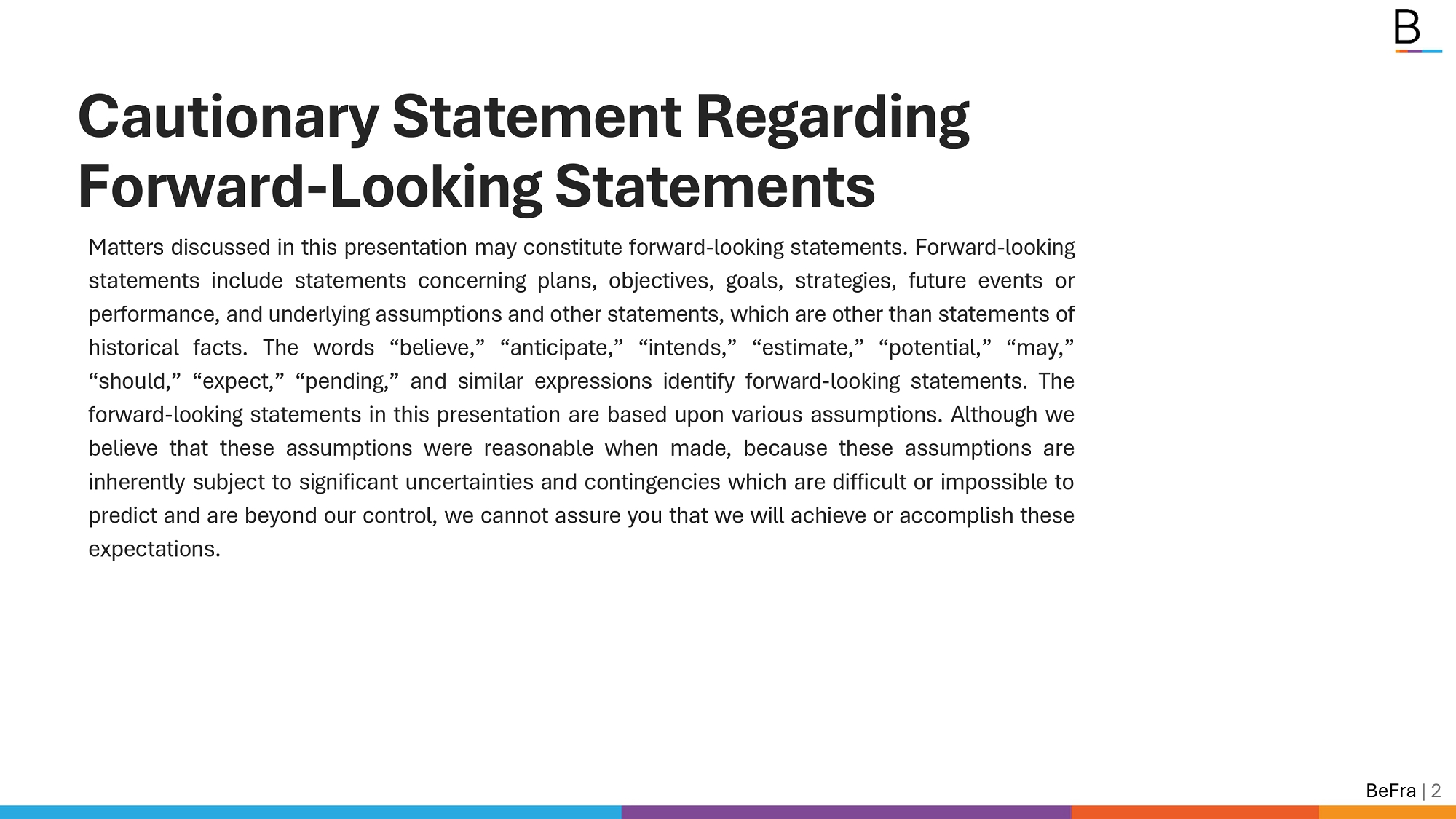Cautionary Statement Regarding Forward - Looking Statements Matters discussed in this presentation may constitute forward - looking statements . Forward - looking statements include statements concerning plans, objectives, goals, strategies, future events or performance, and underlying assumptions and other statements, which are other than statements of historical facts . The words “believe,” “anticipate,” “intends,” “estimate,” “potential,” “may,” “should,” “expect,” “pending,” and similar expressions identify forward - looking statements . The forward - looking statements in this presentation are based upon various assumptions . Although we believe that these assumptions were reasonable when made, because these assumptions are inherently subject to significant uncertainties and contingencies which are difficult or impossible to predict and are beyond our control, we cannot assure you that we will achieve or accomplish these expectations . BeFra | 2