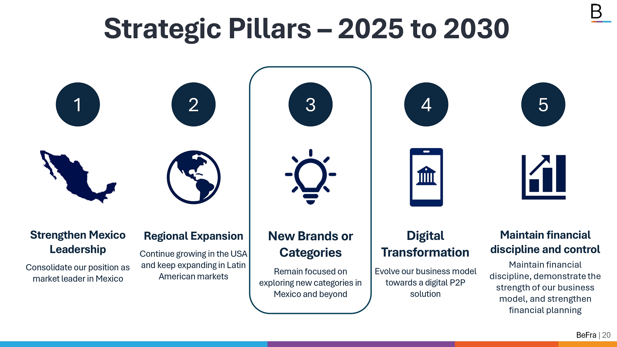 Strengthen Mexico Leadership Consolidate our position as market leader in Mexico New Brands or Categories Remain focused on exploring new categories in Mexico and beyond Regional Expansion Continue growing in the USA and keep expanding in Latin American markets 1 2 3 Digital Transformation Evolve our business model towards a digital P2P solution 4 Maintain financial discipline and control Maintain financial discipline, demonstrate the strength of our business model, and strengthen financial planning 5 Strategic Pillars – 2025 to 2030 BeFra | 23