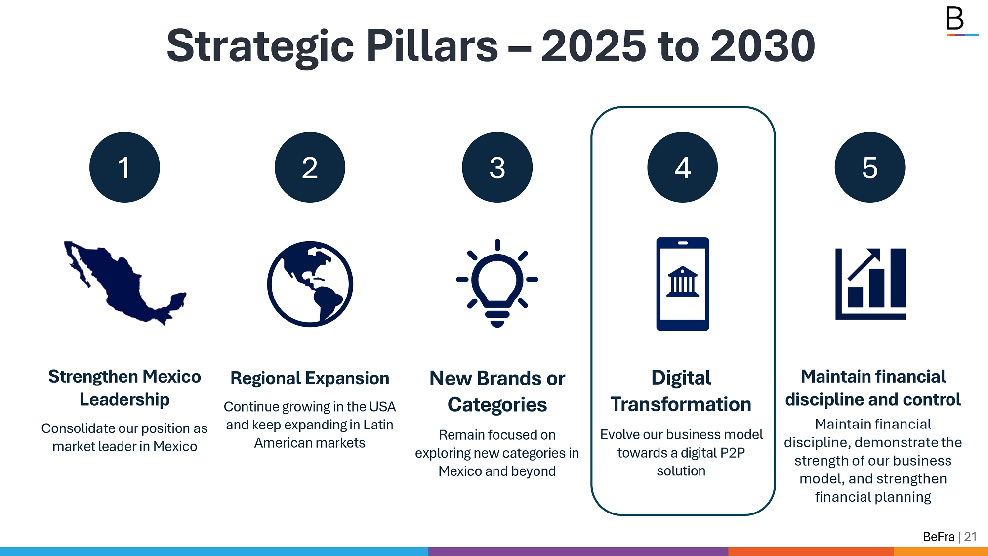 Strengthen Mexico Leadership Consolidate our position as market leader in Mexico New Brands or Categories Remain focused on exploring new categories in Mexico and beyond Regional Expansion Continue growing in the USA and keep expanding in Latin American markets 1 2 3 Digital Transformation Evolve our business model towards a digital P2P solution 4 Maintain financial discipline and control Maintain financial discipline, demonstrate the strength of our business model, and strengthen financial planning 5 Strategic Pillars – 2025 to 2030 BeFra | 20