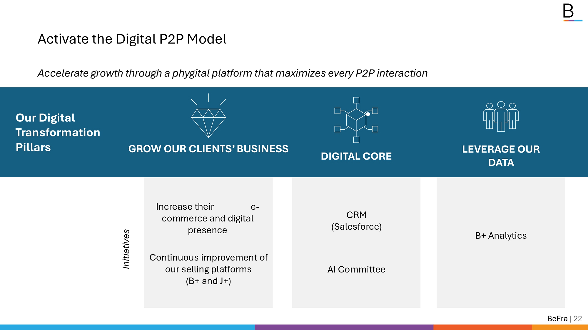 LEVERAGE OUR DATA GROW OUR CLIENTS’ BUSINESS Our Digital Transformation Pillars BeFra | 22 DIGITAL CORE Accelerate growth through a phygital platform that maximizes every P2P interaction Activate the Digital P2P Model Increase their e - commerce and digital presence Continuous improvement of our selling platforms (B+ and J+) Initiatives CRM (Salesforce) AI Committee B+ Analytics