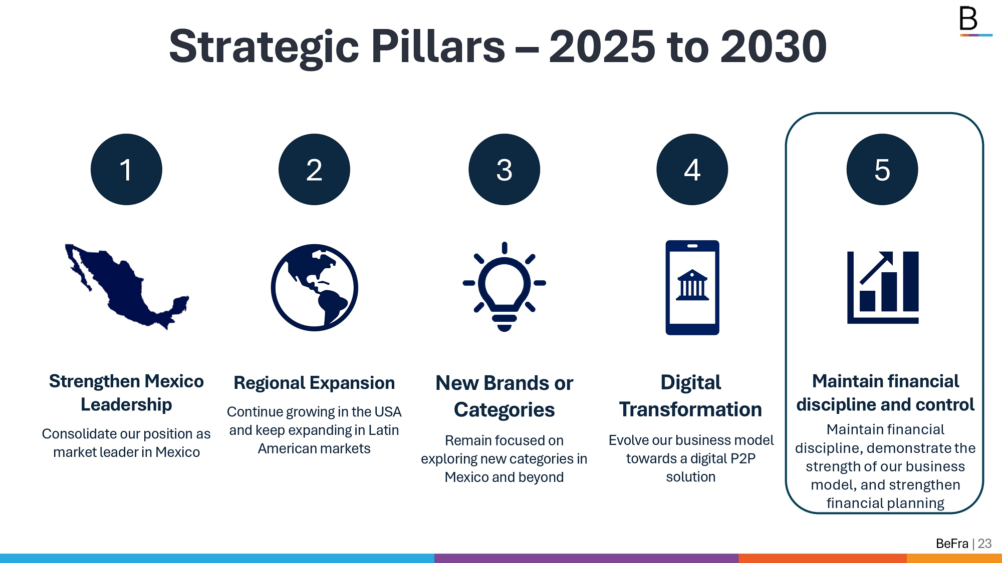 Strengthen Mexico Leadership Consolidate our position as market leader in Mexico New Brands or Categories Remain focused on exploring new categories in Mexico and beyond Regional Expansion Continue growing in the USA and keep expanding in Latin American markets 1 2 3 Digital Transformation Evolve our business model towards a digital P2P solution 4 Maintain financial discipline and control Maintain financial discipline, demonstrate the strength of our business model, and strengthen financial planning 5 Strategic Pillars – 2025 to 2030 BeFra | 21