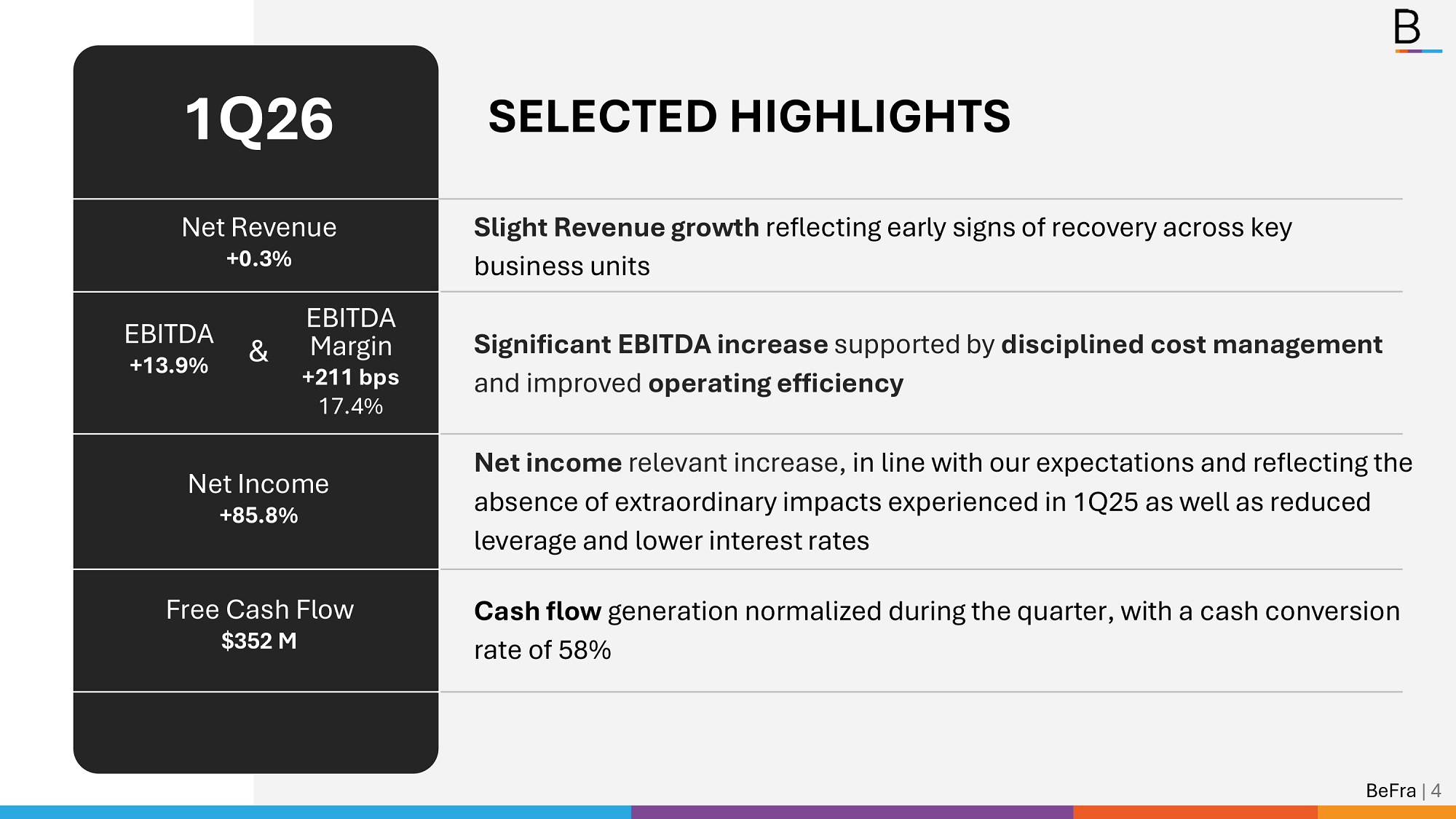 Net Revenue +0.3% EBITDA +13.9% EBITDA Margin +211 bps 17.4% 1Q26 Free Cash Flow $352 M Slight Revenue growth reflecting early signs of recovery across key business units Significant EBITDA increase supported by disciplined cost management and improved operating efficiency Net Income +85.8% Net income relevant increase, in line with our expectations and reflecting the absence of extraordinary impacts experienced in 1Q25 as well as reduced leverage and lower interest rates & Cash flow generation normalized during the quarter, with a cash conversion rate of 58% BeFra | 4 SELECTED HIGHLIGHTS