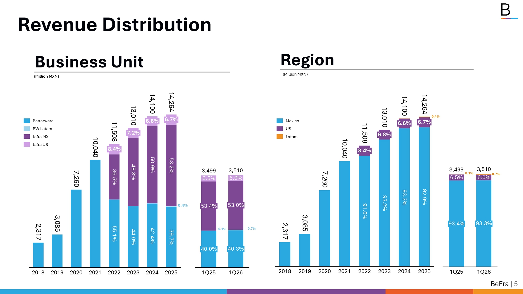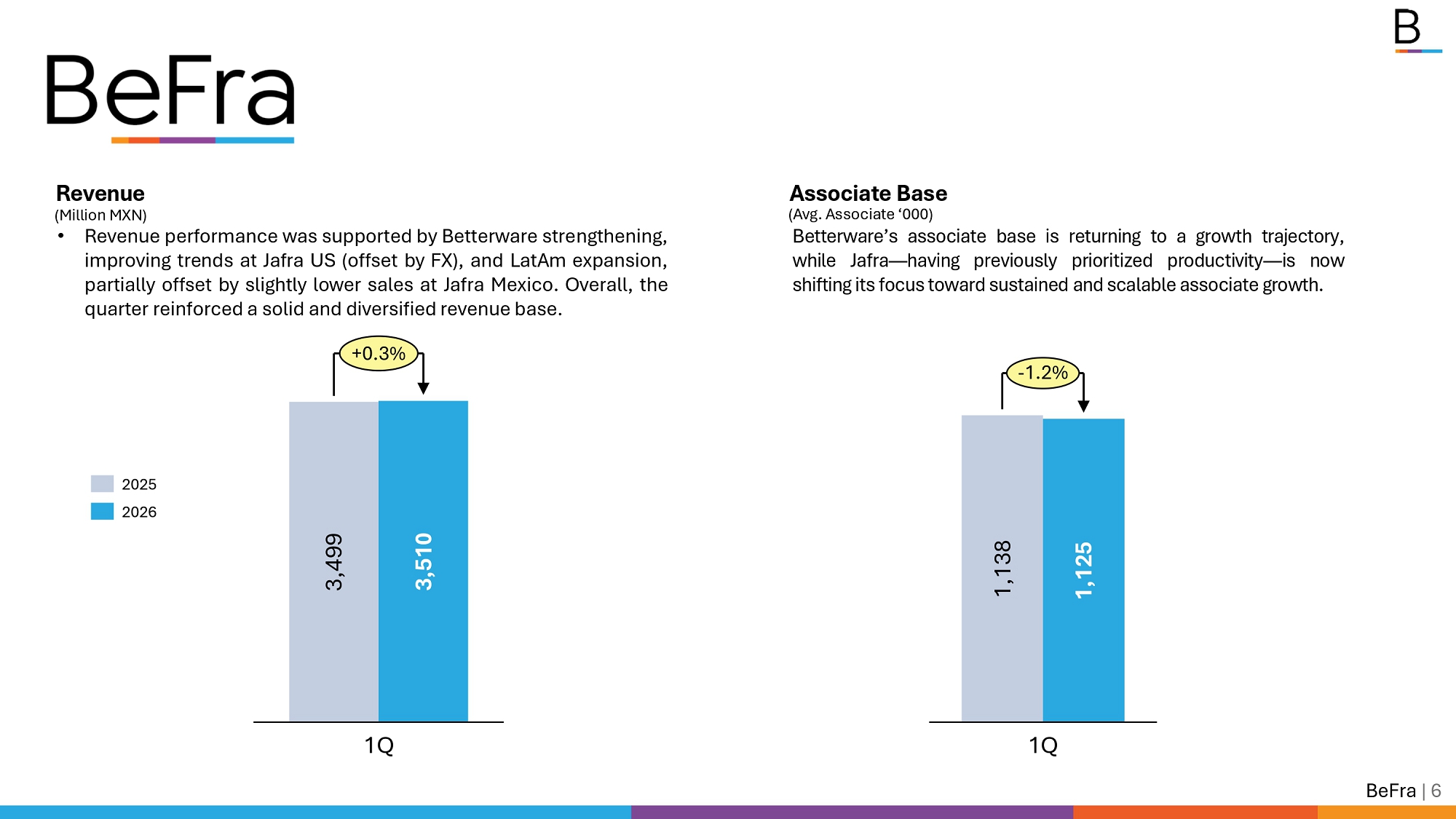 2,317 3,085 7,260 8.4% 36.5% 55.1% 7.2% 48.8% 44.0% 6.6% 50.9% 42.4% 6.7% 53.2% 39.7% 2018 2019 2020 2021 2022 2023 2024 2025 10,040 11,508 13,010 14,100 14,264 2,317 3,085 7,260 8.4 % 91.6% 6.8 % 93.2% 6.6% 93.3% 6.7% 92.9% 2018 2019 2020 2021 2022 2023 2024 2025 10,040 11,508 13,010 14,100 14,264 Revenue Distribution Business Unit (Million MXN) Region (Million MXN) Betterware BW Latam Jafra MX Jafra US Mexico US Latam 0.4% 0.4% 6.5% 1Q25 6.0% 53.4% 53.0% 40.0% 40.3% 1Q26 3,499 3,510 6.5% 93.4% 1Q25 6.0% 93.3% BeFra | 5 1Q26 3,499 3,510 0.1% 0.7% 0.7% 0.1%
