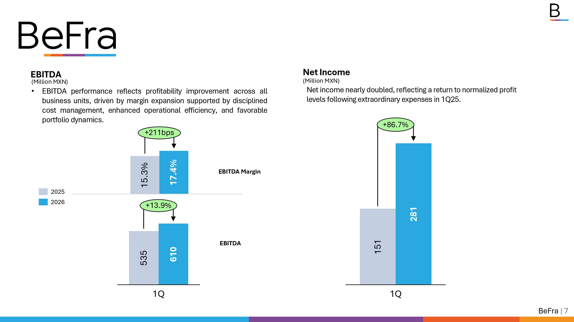 151 281 Net Income (Million MXN) Net income nearly doubled, reflecting a return to normalized profit levels following extraordinary expenses in 1Q25. +86.7% 535 610 +13.9% 2025 2026 15.3% 17.4% EBITDA (Million MXN) • EBITDA performance reflects profitability improvement across all business units, driven by margin expansion supported by disciplined cost management, enhanced operational efficiency, and favorable portfolio dynamics . +211bps EBITDA Margin 1Q 1Q BeFra | 7 EBITDA