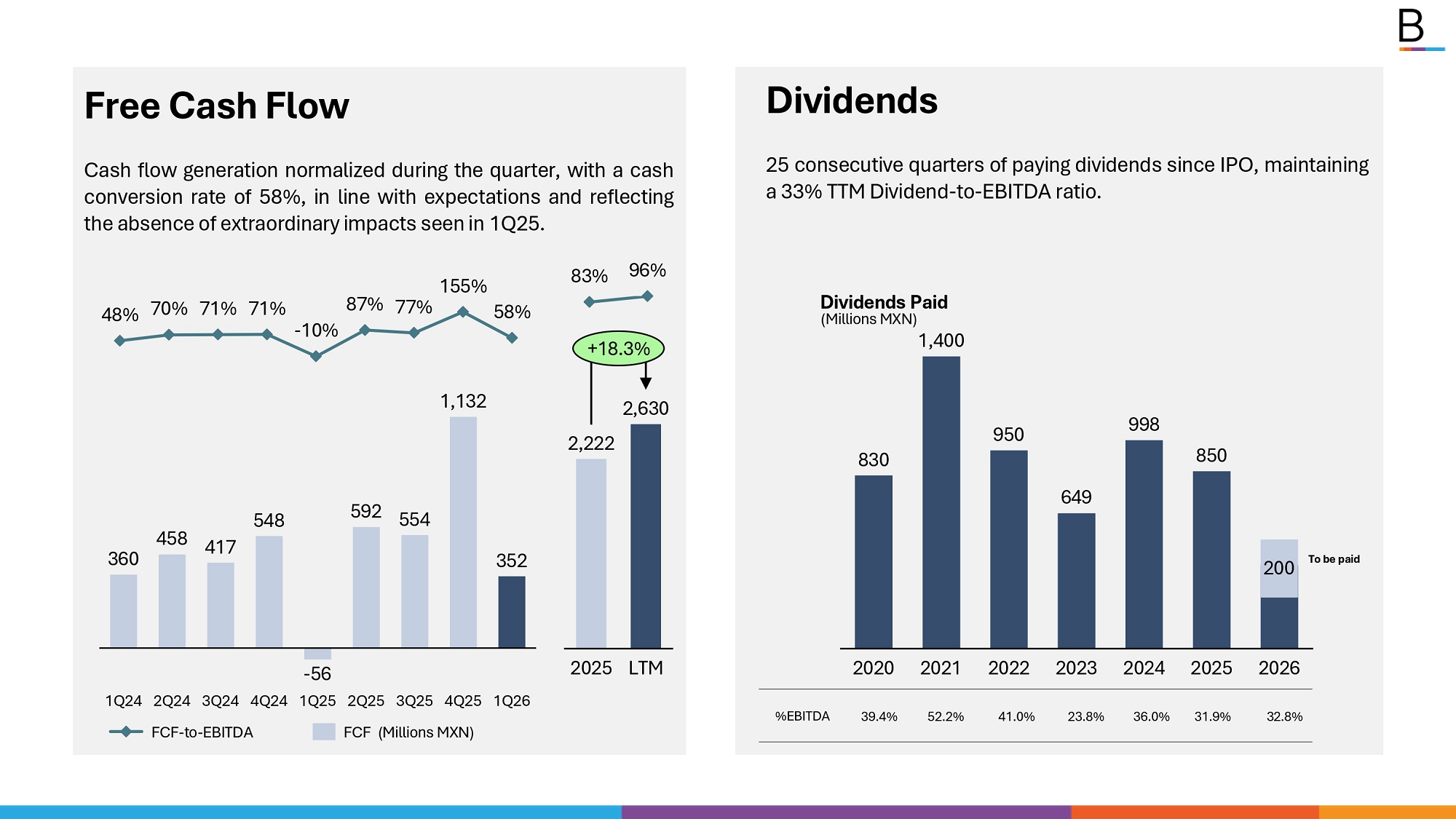 Free Cash Flow Cash flow generation normalized during the quarter, with a cash conversion rate of 58 % , in line with expectations and reflecting the absence of extraordinary impacts seen in 1 Q 25 . 360 458 417 548 - 56 1Q24 2Q24 3Q24 4Q24 1Q25 2Q25 3Q25 4Q25 1Q26 592 554 1,132 352 48% 70% 71% 71% - 10% 87% 77% 155% 58% Dividends 25 consecutive quarters of paying dividends since IPO, maintaining a 33% TTM Dividend - to - EBITDA ratio. 2020 2021 2022 2023 2024 2025 2026 830 950 649 998 850 400 32.8% 31.9% 36.0% 23.8% 41.0% 52.2% 39.4% %EBITDA Dividends Paid (Millions MXN) 1,400 2025 LTM 2,222 2,630 +18.3% 83% 96% FCF - to - EBITDA FCF (Millions MXN) To be paid 200