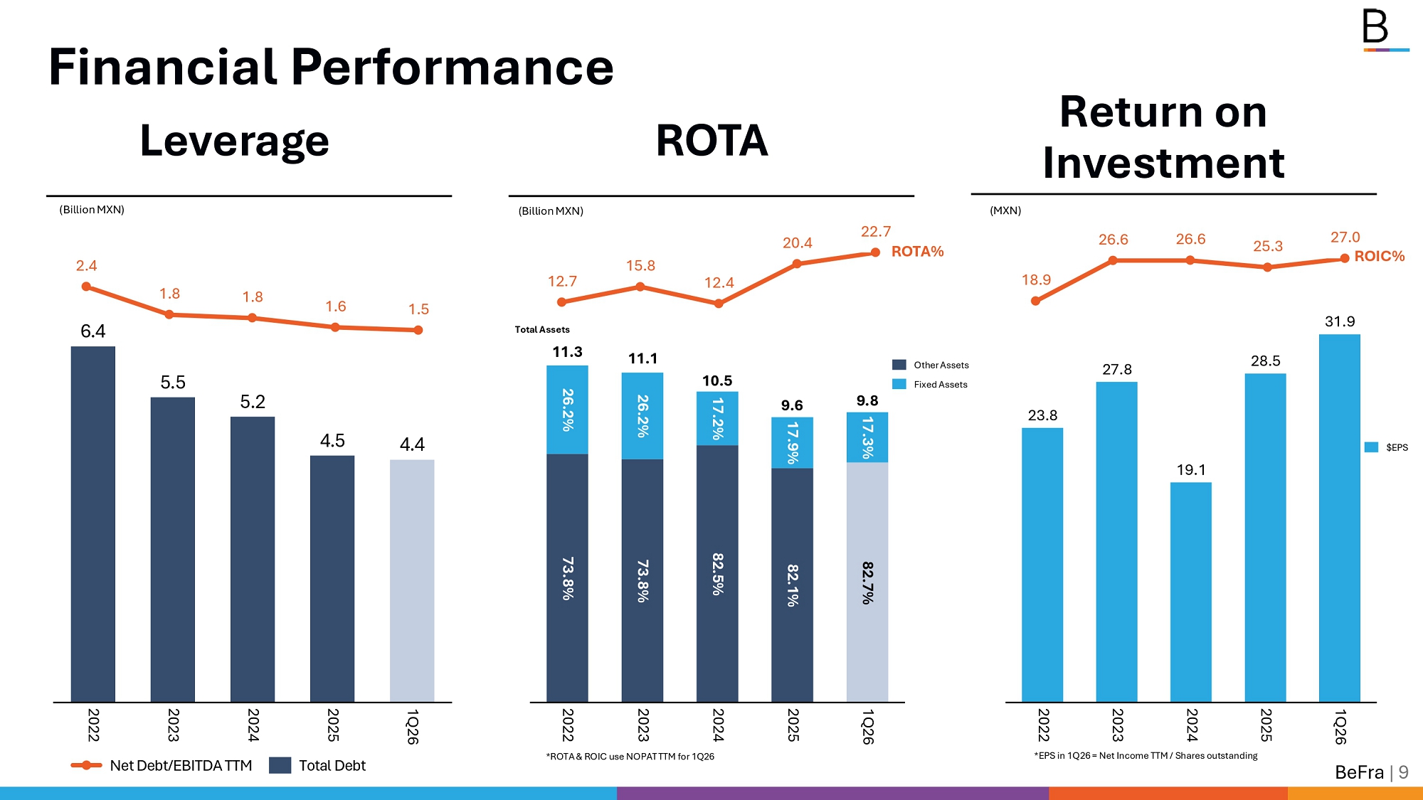 6.4 5.5 5.2 4.5 4.4 2022 2023 2024 2025 1Q26 2.4 1.8 1.8 1.6 1.5 Financial Performance Leverage ROTA Return on Investment 26.2% 73.8% 2022 26.2% 73.8% 2023 17.2% 82.5% 2024 17.9% 82.1% 2025 17.3% 82.7% 1Q26 12.7 15.8 12.4 20.4 22.7 11.3 11.1 10.5 9.6 9.8 23.8 27.8 19.1 28.5 31.9 2022 2023 2024 2025 1Q26 $EPS 18.9 26.6 26.6 25.3 27.0 ROIC% (Billion MXN) (Billion MXN) (MXN) Other Assets Fixed Assets *EPS in 1Q26 = Net Income TTM / Shares outstanding *ROTA & ROIC use NOPAT TTM for 1Q26 Net Debt/EBITDA TTM Total Debt BeFra | 9 Total Assets ROTA%